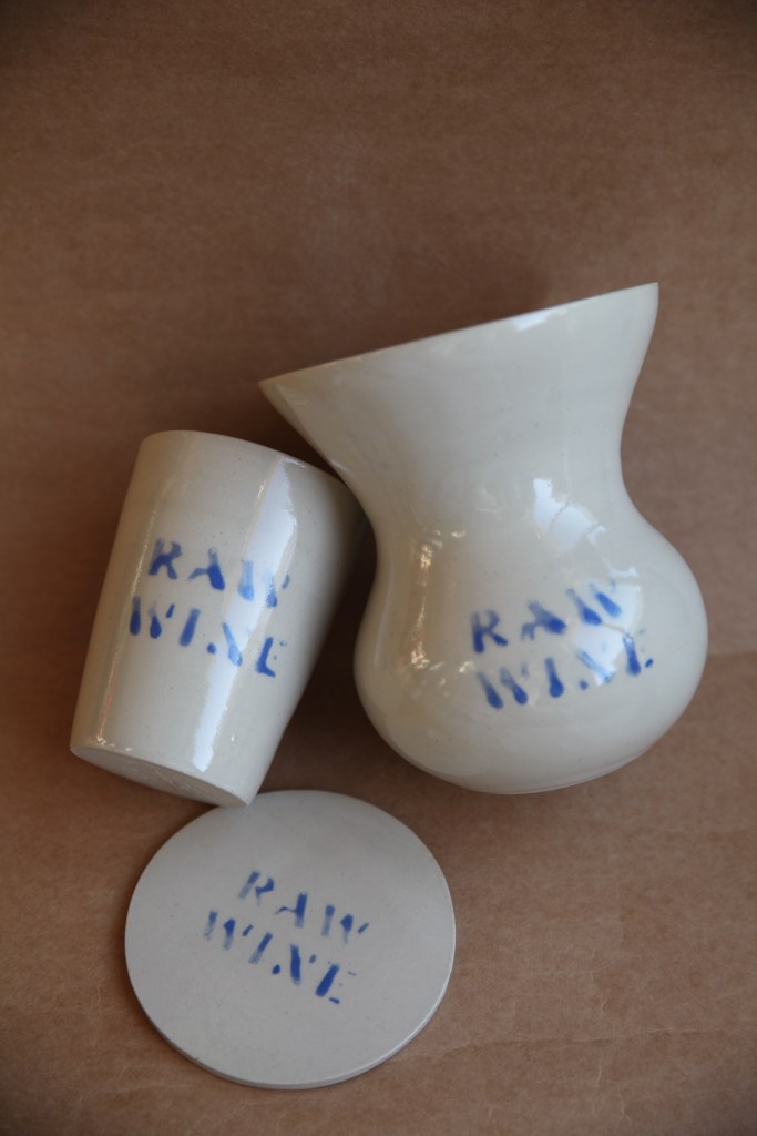 Enfin, en 2026, j’ai collaboré avec Raw Wine, salon de vins biologiques et biodynamiques international, pour la production d’objets de merchandising estampillés de leur logo : des crachoirs individuels, des gobelets, et des sous-verres (photographie ci-contre).
